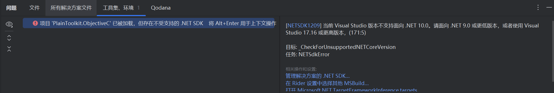 我安装了 .NET 10 测试版 SDK,并且使用已经支持 .NET 10 的 Rider 2025.2.1。但是当我打开 .NET 10 项目时:遇到以下报错: